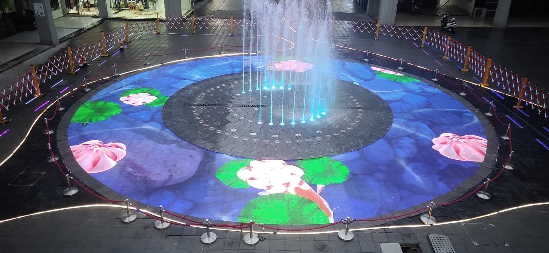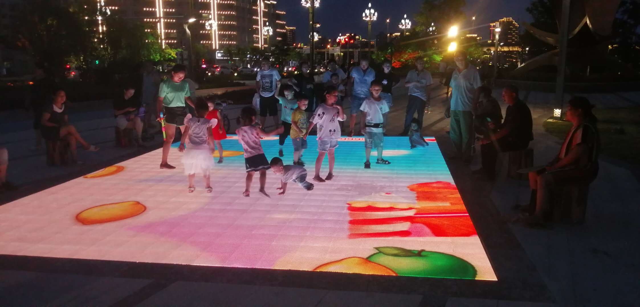 位于某公园的的LED互动户外地面屏每到天黑之后,便有大量游客进行体验。LED互动地面屏上会不断投射出烟花、湖水、鱼、乌龟等图案。当游客踩在这些图案上时, 图案会发生相应变化:烟花会散开,鱼、乌龟会跑开,湖水则产生涟漪,而音响会发生相应声响。大量游客对此乐此不疲,欢声笑语不断.